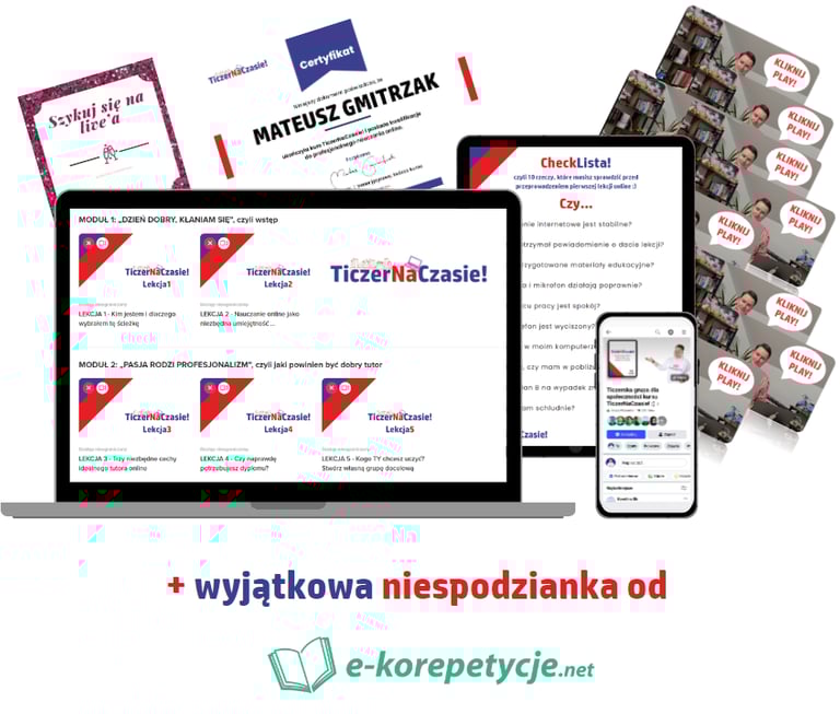 Oprócz dostępu do platformy szkoleniowej TiczerNaCzasie!, dzięki której zaczniesz uczyć online i zarabiać dużo więcej niż w szkole otrzymasz także: